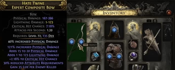 Det andre våpenet vi trenger er en bue med spesifikke egenskaper. Den viktigste statistikken er fysisk skade og lynskade, som er avgjørende for dette bygget. Lynskaden vil skalere fra vår fysiske skade og også øke sjansen for å sjokkere fiender. I tillegg er det svært gunstig å ha angrepshastighet på baugen.